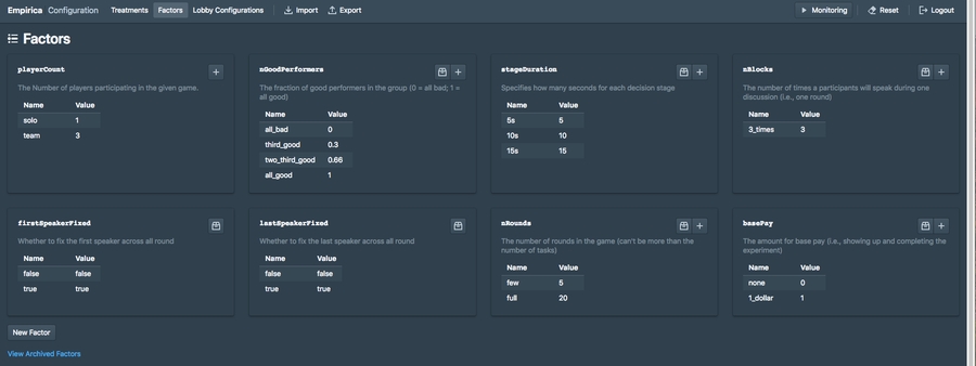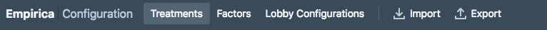 Now, you have the option to create your own configuration (see below) or load an example configuration by clicking on import and then choosing the file ./example-config. Loading the example configurations will choose some example values for the factors (i.e., independent variables), lobby configuration, and few treatments.