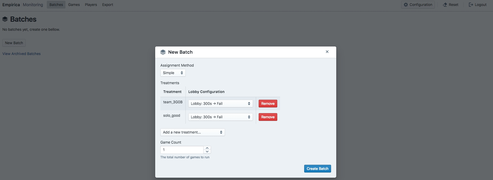 Now the Batchs tab make sure you add a new batch, add the treatments you want, choose your lobby configurations, and then start the batch.